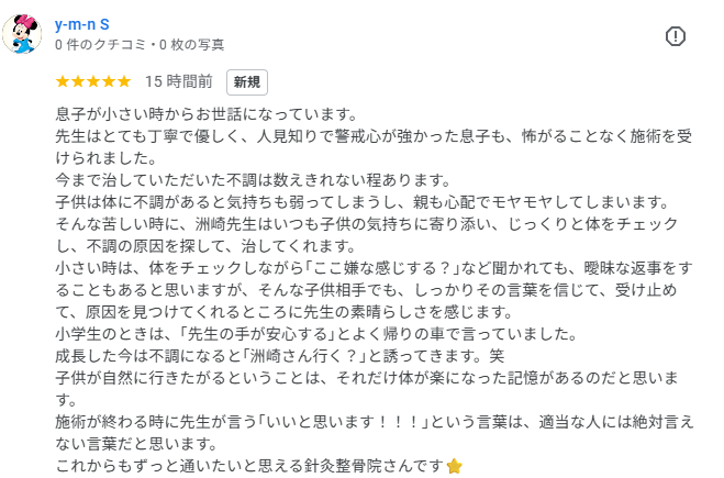 先生はとても丁寧で優しく、人見知りで警戒心が強かった息子も、怖がることなく施術を受けられました。
