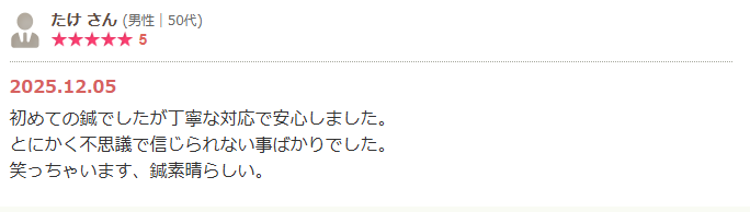 初めての鍼でしたが丁寧な対応で安心しました。 とにかく不思議で信じられない事ばかりでした。 笑っちゃいます、鍼素晴らしい。
