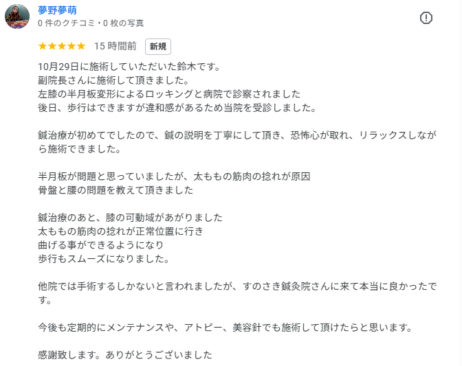 他院では手術するしかないと言われましたが、すのさき鍼灸院さんに来て本当に良かったです。