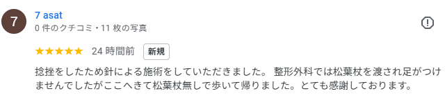 捻挫をしたため針による施術をしていただきました。 整形外科では松葉杖を渡され足がつけませんでしたがここへきて松葉杖無しで歩いて帰りました。とても感謝しております。