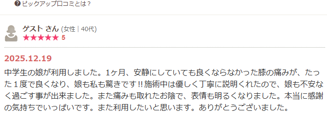 中学生の娘が利用しました。1ヶ月、安静にしていても良くならなかった膝の痛みが、たった1度で良くなり、娘も私も驚きです‼︎施術中は優しく丁寧に説明くれたので、娘も不安なく過ごす事が出来ました。また痛みも取れたお陰で、表情も明るくなりました。本当に感謝の気持ちでいっぱいです。また利用したいと思います。ありがとうございました。